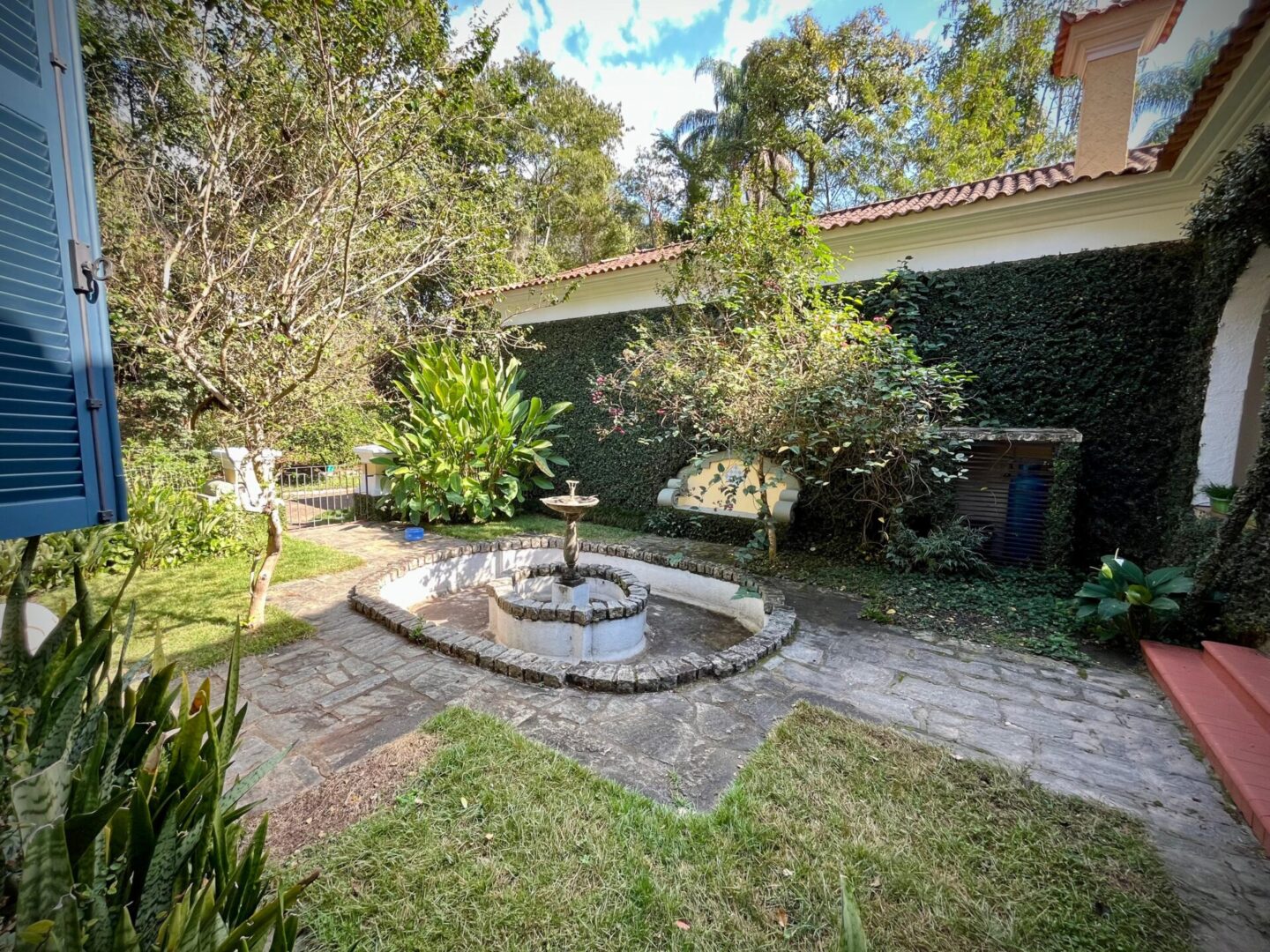 São dois portões de entrada. Pela escadaria chegamos ao salão colonial com lareira, sala de estar, escritório, sala de TV, cinco quartos com armários embutidos, sendo duas suítes e a principal com “closet”.